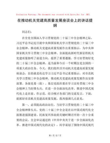 / 在推动机关党建高质量发展座谈会上的讲话提纲