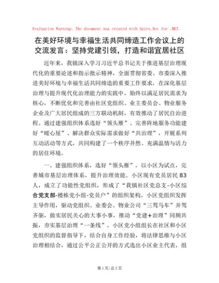 / 在美好环境与幸福生活共同缔造工作会议上的交流发言:坚持党建引领,打造和谐宜居社区