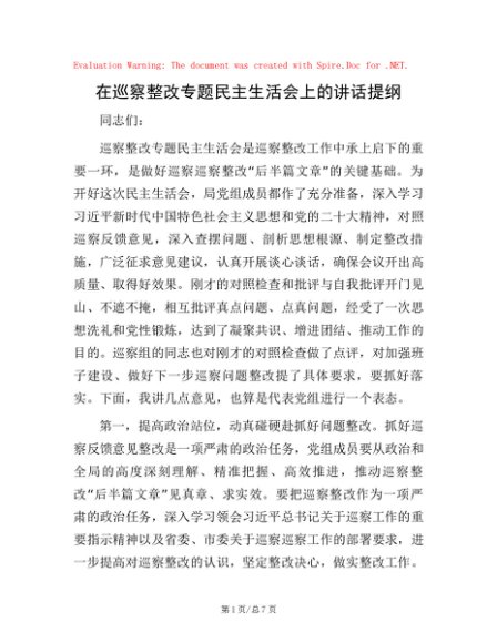 / 在巡察整改专题民主生活会上的讲话提纲