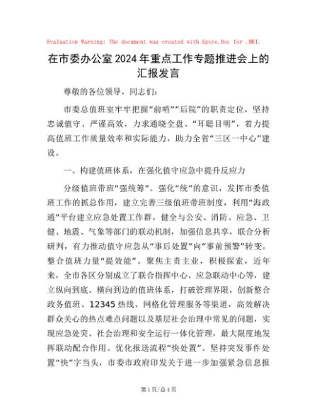 / 在市委办公室2024年重点工作专题推进会上的汇报发言