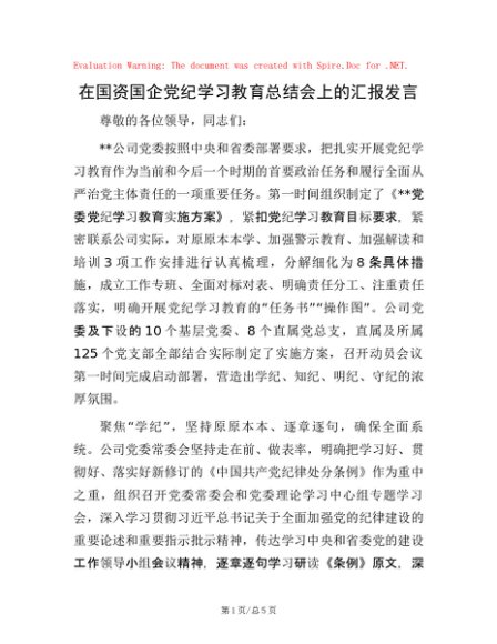 / 在国资国企党纪学习教育总结会上的汇报发言