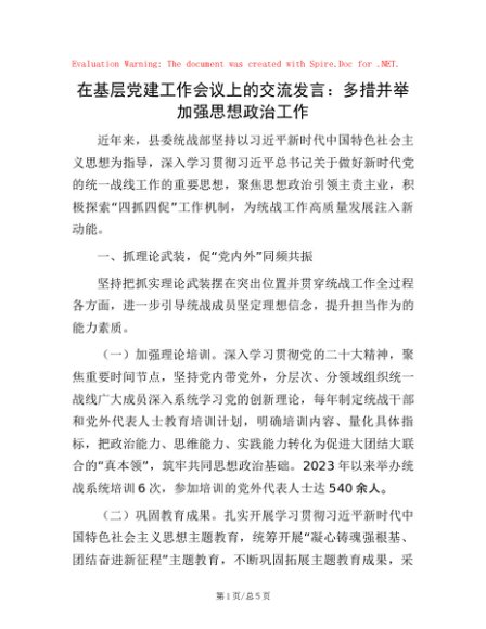 / 在基层党建工作会议上的交流发言:多措并举加强思想政治工作