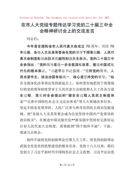 / 在市人大党组专题传达学习党的二十届三中全会精神研讨会上的交流发言
