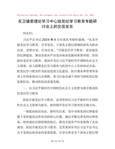 / 在卫健委理论学习中心组党纪学习教育专题研讨会上的交流发言
