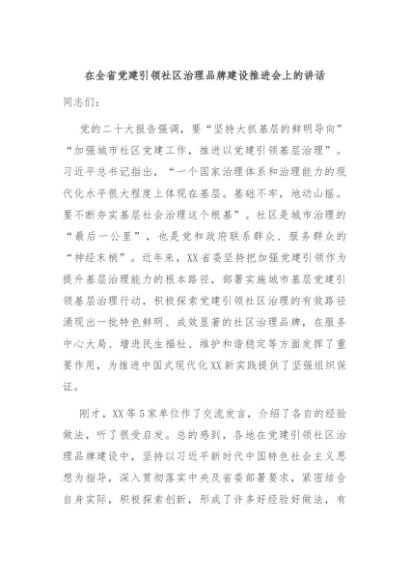 / 在全省党建引领社区治理品牌建设推进会上的讲话