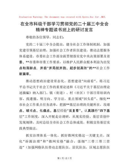 / 在全市科级干部学习贯彻党的二十届三中全会精神专题读书班上的研讨发言