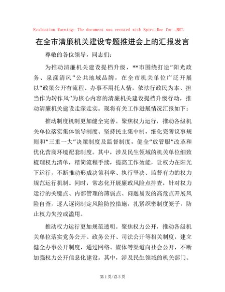 / 在全市清廉机关建设专题推进会上的汇报发言