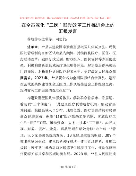 / 在全市深化“三医”联动改革工作推进会上的汇报发言