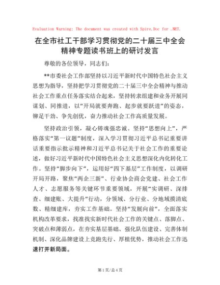 / 在全市社工干部学习贯彻党的二十届三中全会精神专题读书班上的研讨发言