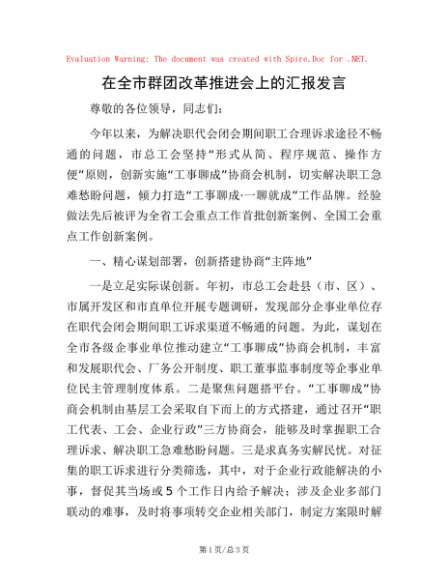 / 在全市群团改革推进会上的汇报发言
