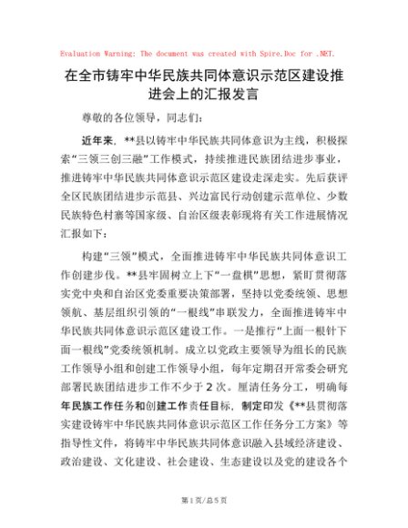 / 在全市铸牢中华民族共同体意识示范区建设推进会上的汇报发言