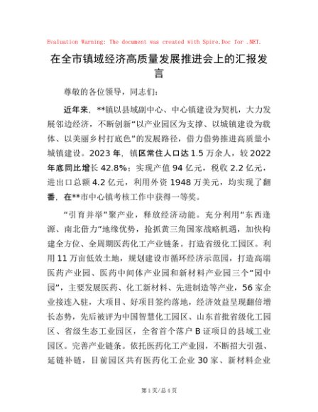 / 在全市镇域经济高质量发展推进会上的汇报发言