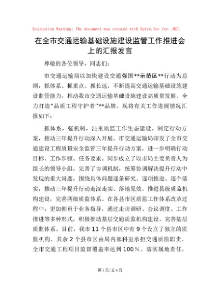 / 在全市交通运输基础设施建设监管工作推进会上的汇报发言