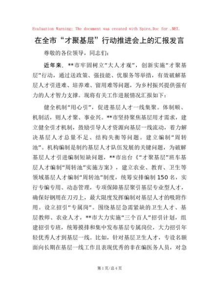 / 在全市“才聚基层”行动推进会上的汇报发言