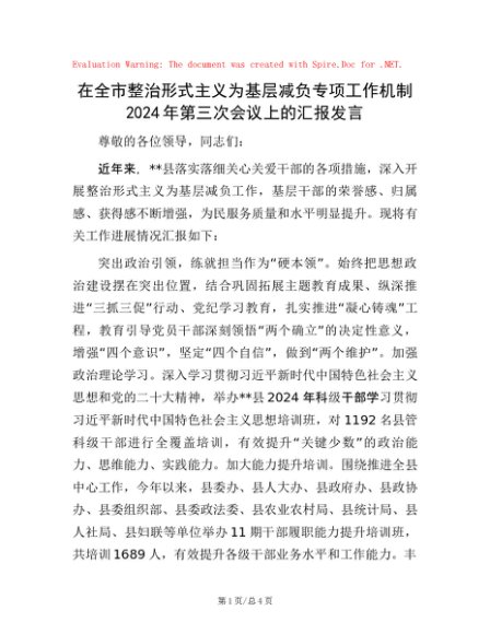 / 在全市整治形式主义为基层减负专项工作机制2024年第三次会议上的汇报发言