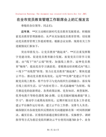 / 在全市党员教育管理工作联席会上的汇报发言