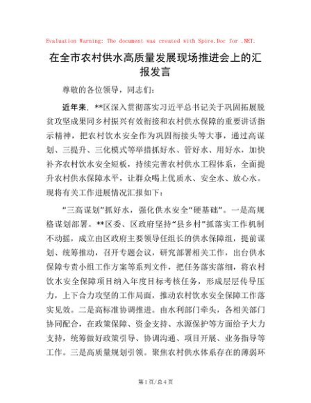 / 在全市农村供水高质量发展现场推进会上的汇报发言