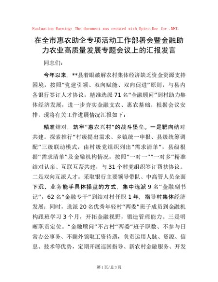 / 在全市惠农助企专项活动工作部署会暨金融助力农业高质量发展专题会议上的汇报发言