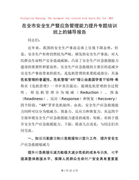 / 在全市安全生产暨应急管理能力提升专题培训班上的辅导报告