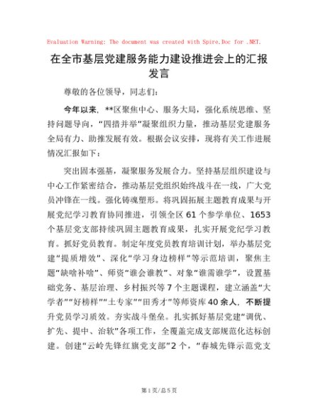 / 在全市基层党建服务能力建设推进会上的汇报发言