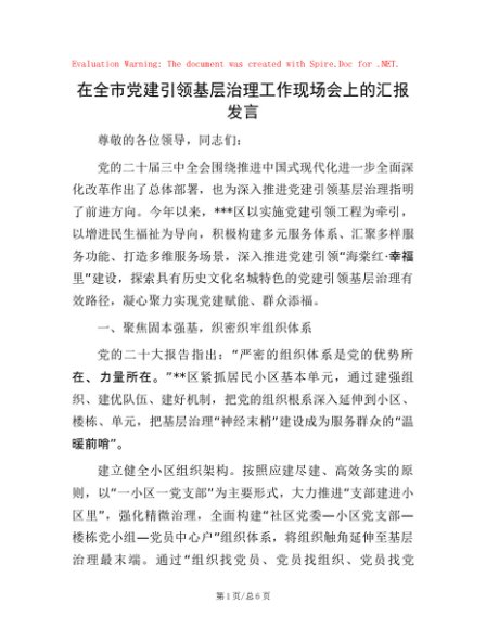 / 在全市党建引领基层治理工作现场会上的汇报发言
