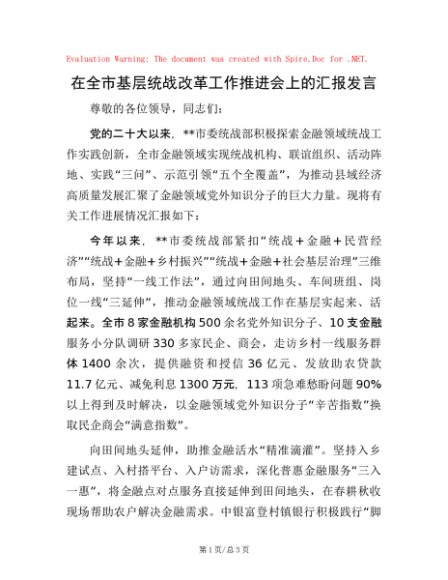 / 在全市基层统战改革工作推进会上的汇报发言
