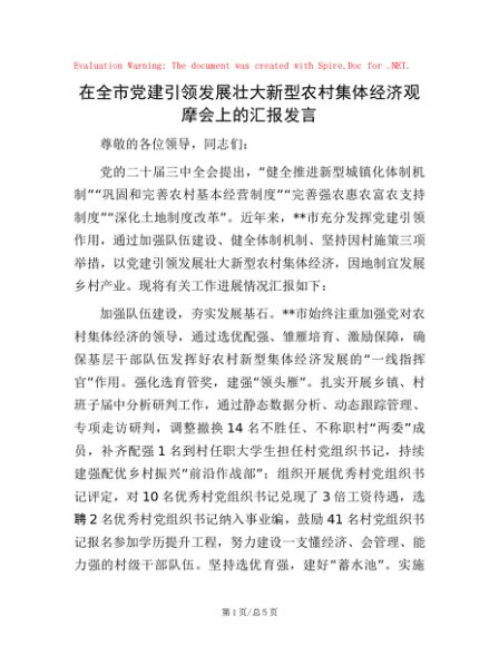 / 在全市党建引领发展壮大新型农村集体经济观摩会上的汇报发言