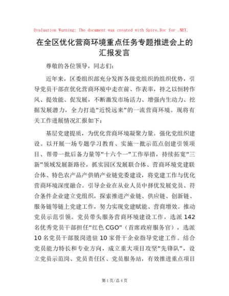 / 在全区优化营商环境重点任务专题推进会上的汇报发言
