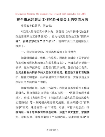 / 在全市思想政治工作经验分享会上的交流发言