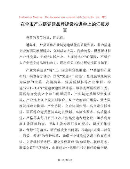 / 在全市产业链党建品牌建设推进会上的汇报发言