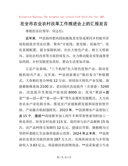 / 在全市农业农村改革工作推进会上的汇报发言