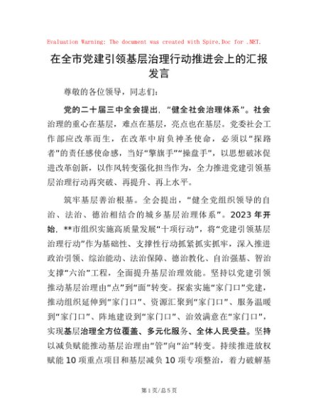 / 在全市党建引领基层治理行动推进会上的汇报发言