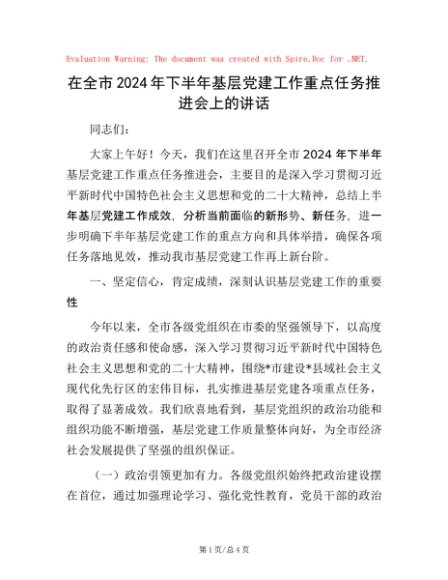 / 在全市2024年下半年基层党建工作重点任务推进会上的讲话
