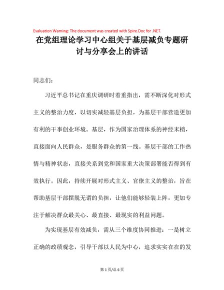 / 在党组理论学习中心组关于基层减负专题研讨与分享会上的讲话