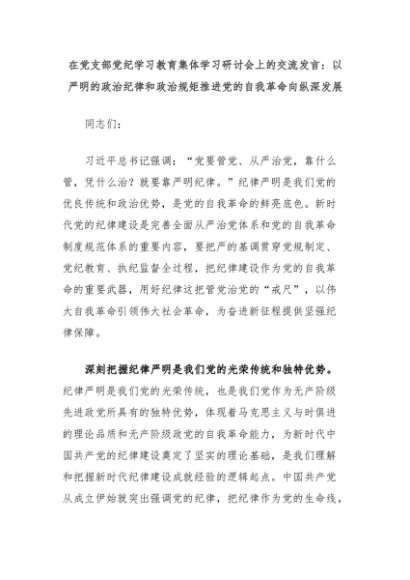 / 在党支部党纪学习教育集体学习研讨会上的交流发言:以严明的政治纪律和政治规矩推进党的自我革命向纵深发展