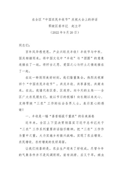/ 在全区“中国农民丰收节”庆祝大会上的讲话