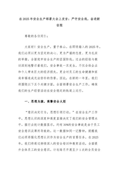 / 在2025年安全生产部署大会上发言:严守安全线,奋进新征程