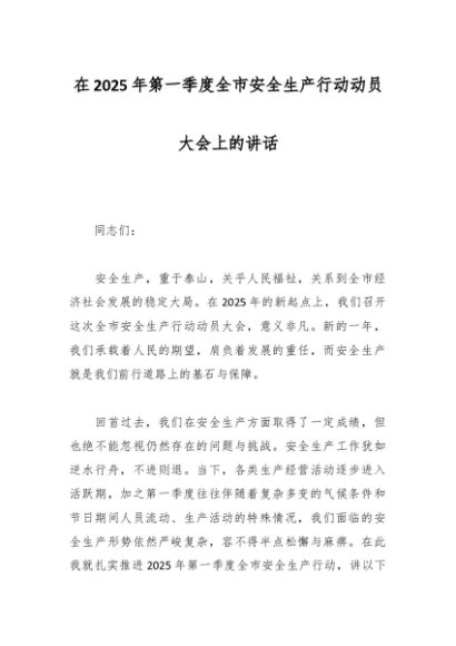 / 在2025年第一季度全市安全生产行动动员大会上的讲话