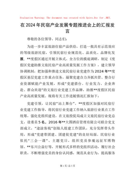 / 在2024年民宿产业发展专题推进会上的汇报发言