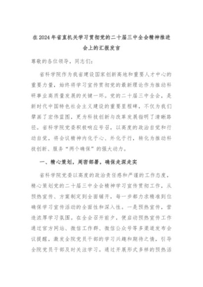 / 在2024年省直机关学习贯彻党的二十届三中全会精神推进会上的汇报发言