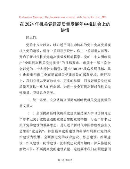 / 在2024年机关党建高质量发展年中推进会上的讲话