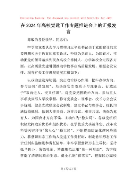 / 在2024年高校党建工作专题推进会上的汇报发言