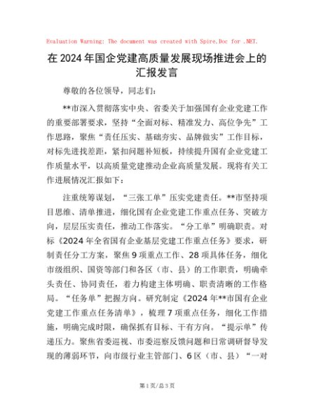 / 在2024年国企党建高质量发展现场推进会上的汇报发言