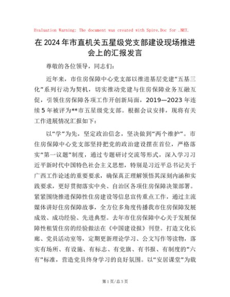/ 在2024年市直机关五星级党支部建设现场推进会上的汇报发言