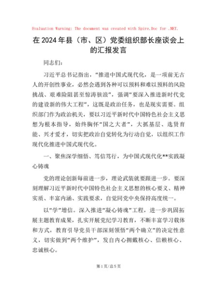 / 在2024年县(市、区)党委组织部长座谈会上的汇报发言
