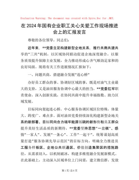/ 在2024年国有企业职工关心关爱工作现场推进会上的汇报发言