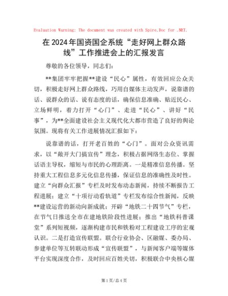 / 在2024年国资国企系统“走好网上群众路线”工作推进会上的汇报发言