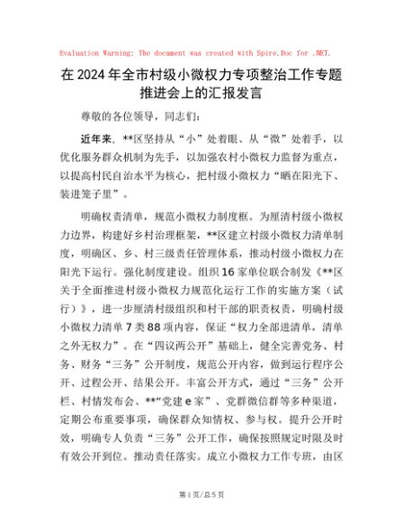 / 在2024年全市村级小微权力专项整治工作专题推进会上的汇报发言