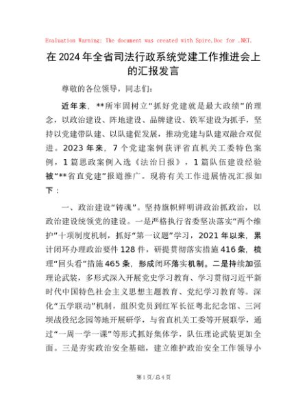 / 在2024年全省司法行政系统党建工作推进会上的汇报发言