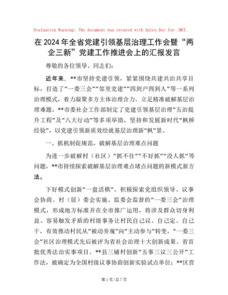 / 在2024年全省党建引领基层治理工作会暨“两企三新”党建工作推进会上的汇报发言